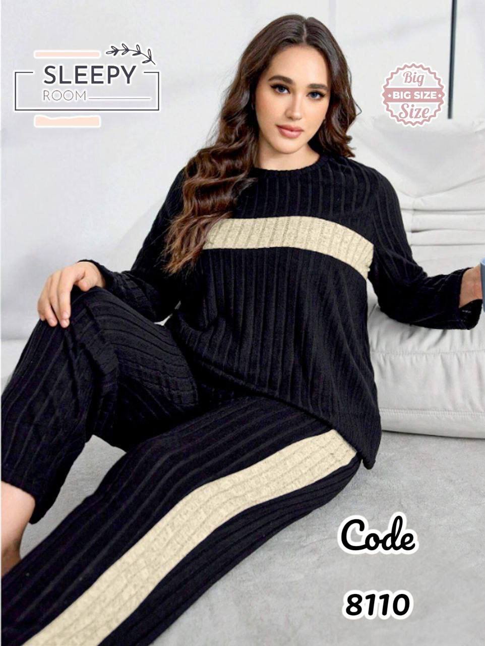 تتوفر البيجامة بمقاسات تبدأ من 85 كجم حتى 130 كجم، ما يجعلها خياراً مرناً لجميع الفئات. كما تتميز بتصميم واسع ومريح يناسب الجلوس والتنقل بسهولة. يأتي المنتج تحت الكود: 8110، مما يسهّل عملية الطلب.
